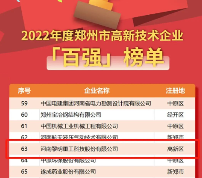 近日,黎明重工再創(chuàng)佳績,鄭州市科學技術情報研究所公布了2022年度鄭州市高新技術企業(yè)“雙百”榜單,黎明重工憑借過硬的企業(yè)實力成功入選。